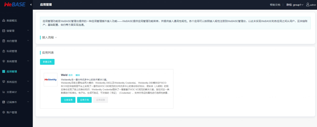 WeBASE v1.5.0 的更新带来了新的操作方式,新增了应用管理功能,使WeBASE在架构上更加开放了;支持区块链应用以插件化的形式添加到WeBASE中,实现统一管理。