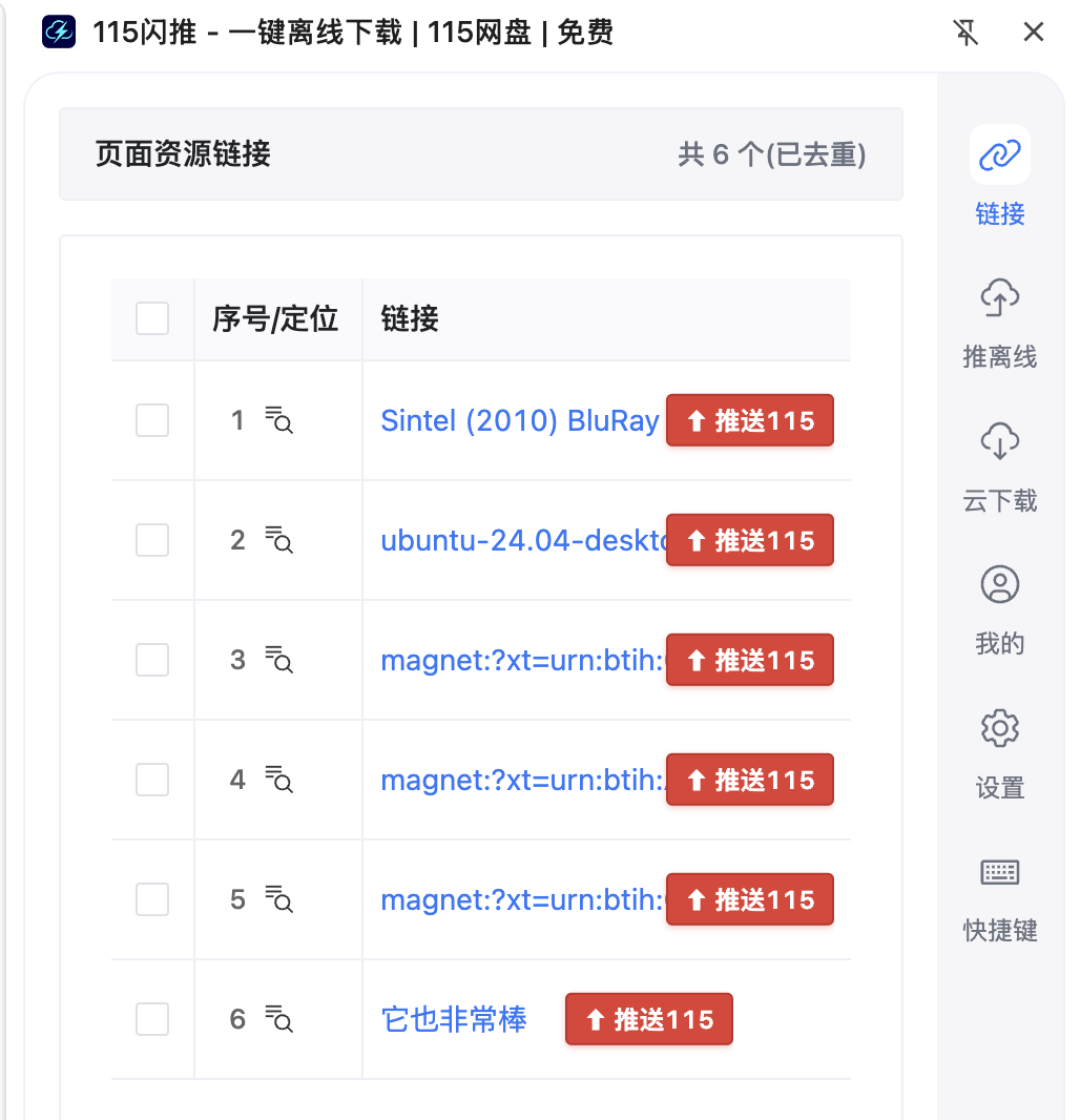 115闪推是一款专为115网盘用户打造的免费的Chrome浏览器扩展。它的核心功能只有一个,但却直击痛点:自动识别网页上的下载链接,并提供一键批量推送到115网盘离线任务的功能。