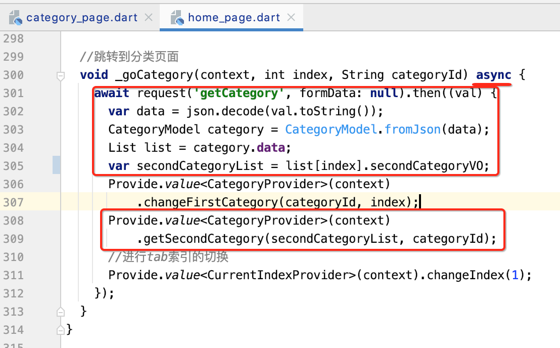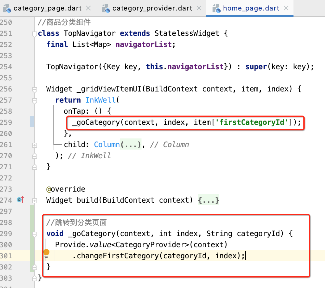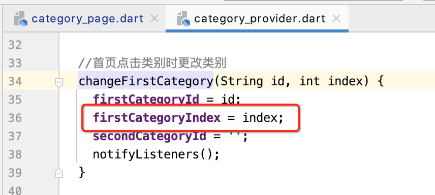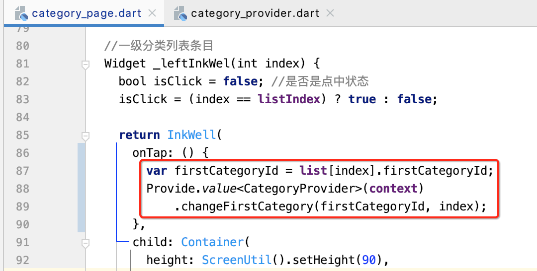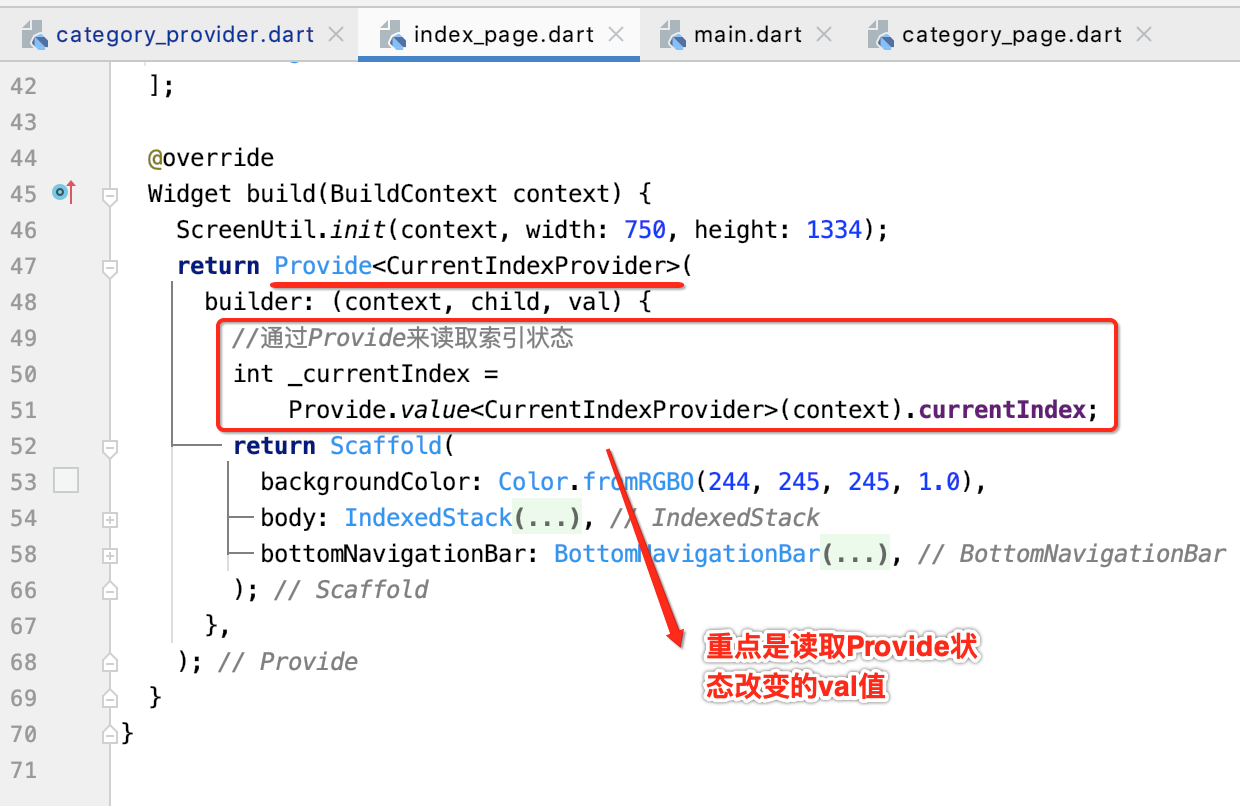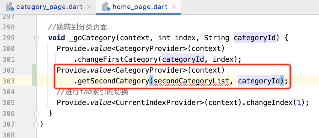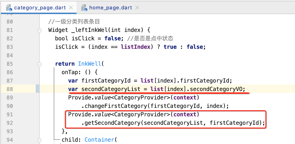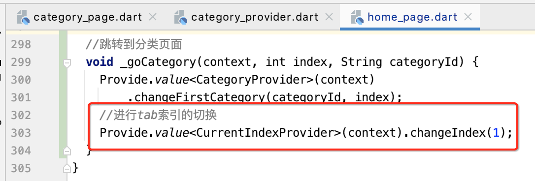 此时只改变了分类的索引,还没有进行Tab的切换,所以还需要做一步处理,关于Tab的切换还有印象么,也是调用跟Tab状态切换的Provide,如下: