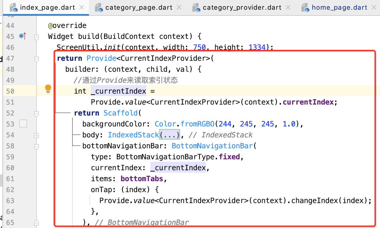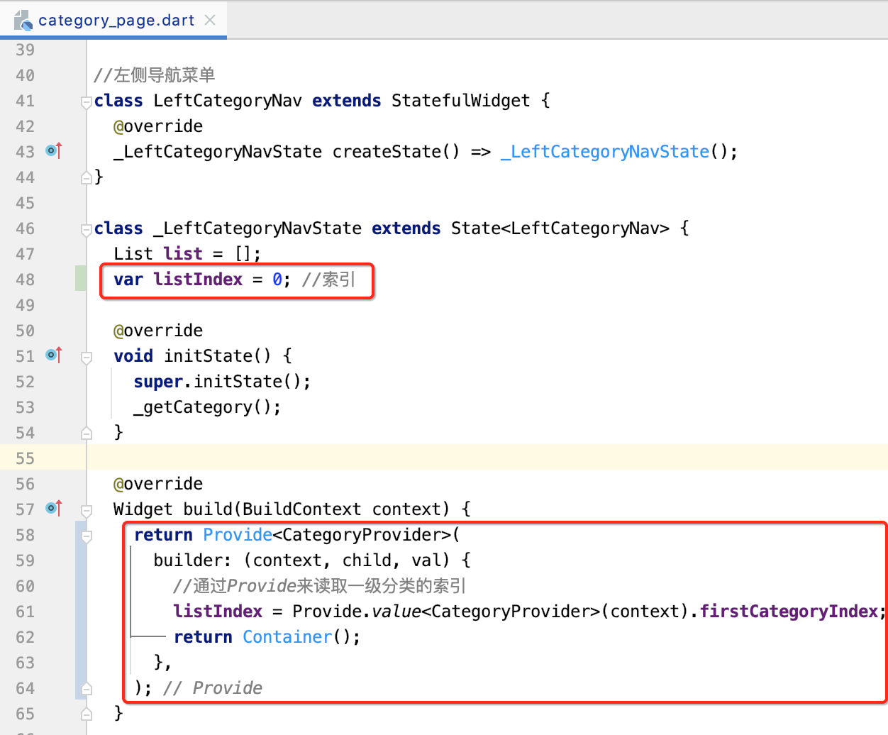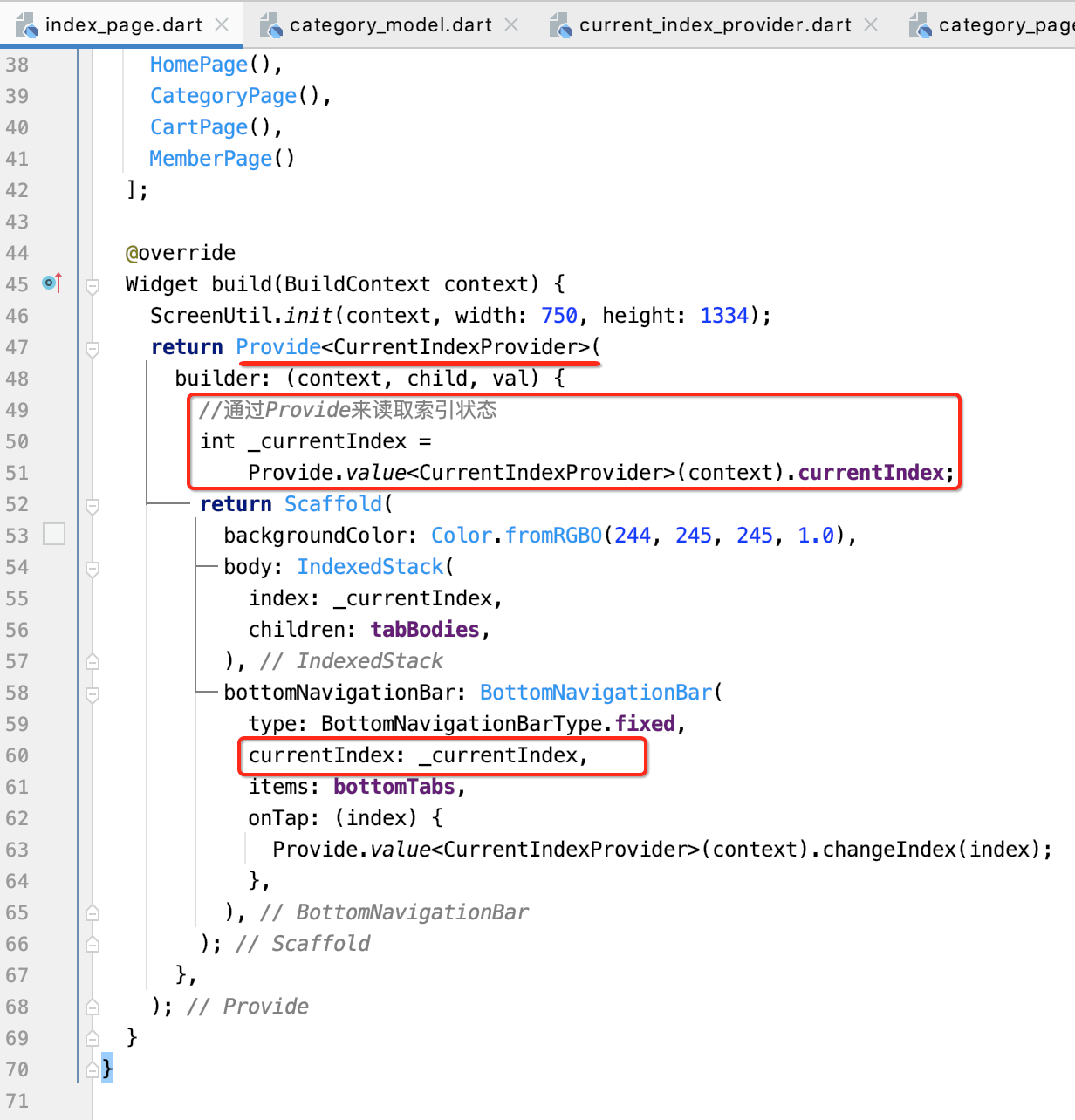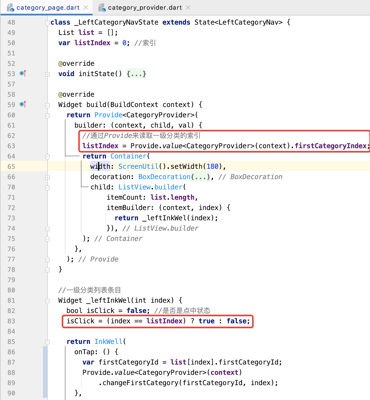 此时只改变了分类的索引,还没有进行Tab的切换,所以还需要做一步处理,关于Tab的切换还有印象么,也是调用跟Tab状态切换的Provide,如下: