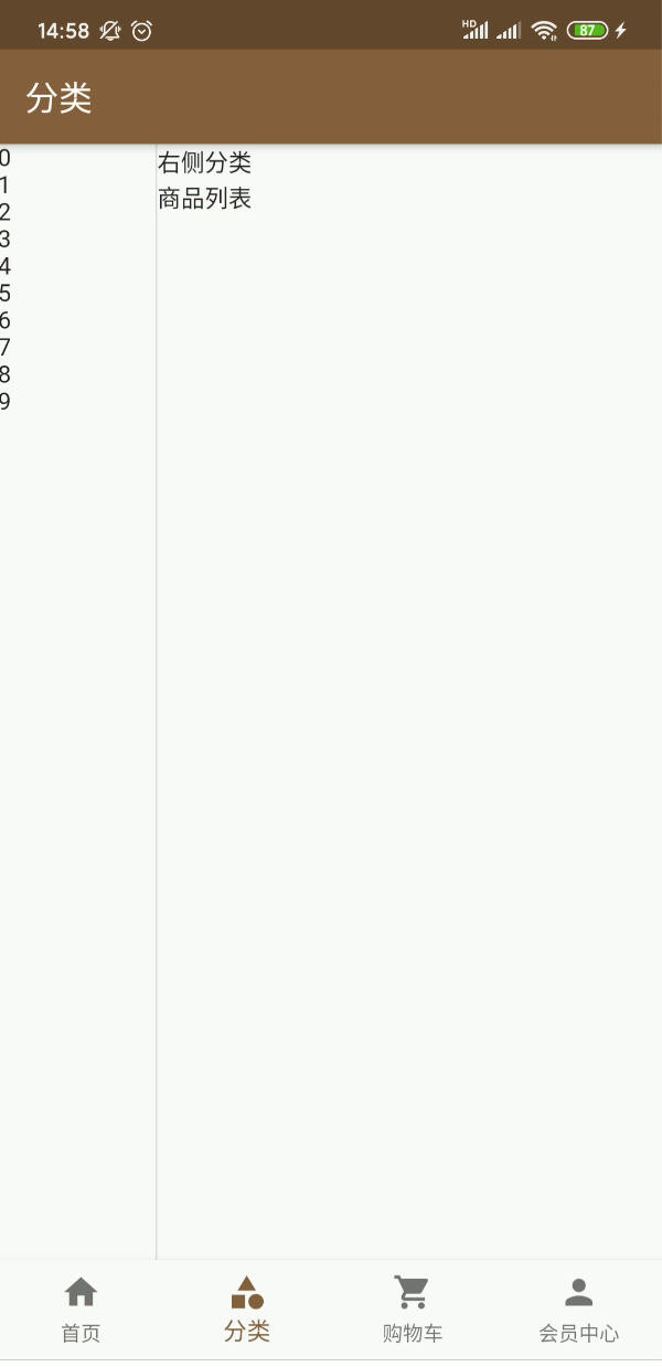 接下来分类页面就只剩分类商品列表显示功能了,这块下次继续,最后,将目前实现的效果在IOS上运行瞅一下: