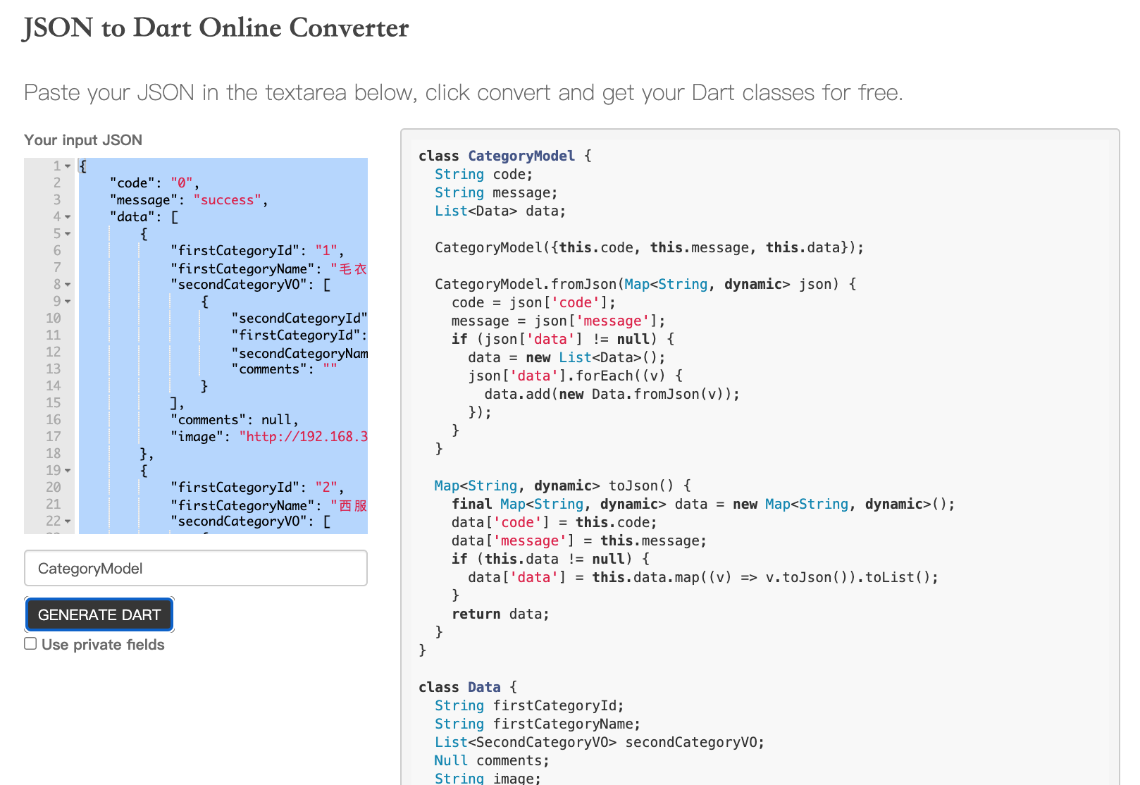 那,在Flutter开发中,有木有类似的自动帮忙生成实体的方式呢?这里没有比较好集成在Android Studio中的插件,在网上搜了个在线的:https://jsontodart.com/,也还行,咱们试一下:
