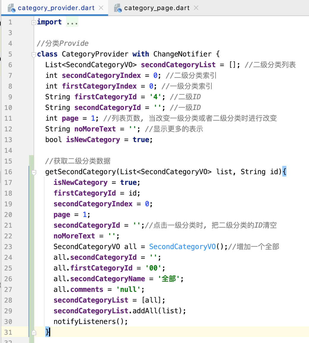 首先是在点击左侧一级分类时,需要获取二级分类的数据,这里也是调一下Provide相关方法既可,如下: