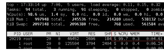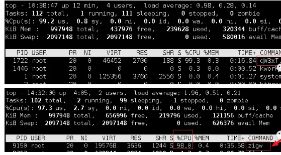 挖矿程序的进程一般都是以一些数字加大小写字母组合的进程名字,比如:WaKuang,Qw1a,Poa1等等的挖矿进程名字,有的甚至伪装成正常的进程名来绕过管理员的查杀,最简单的办法就是通过TOP命令看当前占用CPU最高的进程来确定。