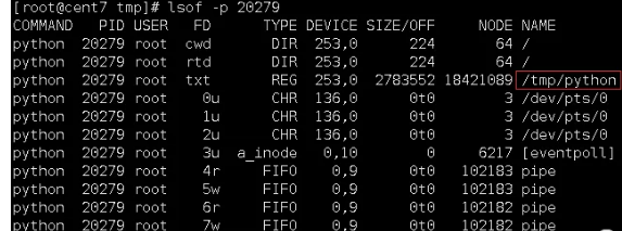看到恶意的进程我们来看下进程的程序是在哪里调用的,lsof -p pid执行这个命令,把TOP看到进程PID写上,比如我的PID是888 那就执行lsof -p 888,我们可以看到调用的程序文件位置在哪里。