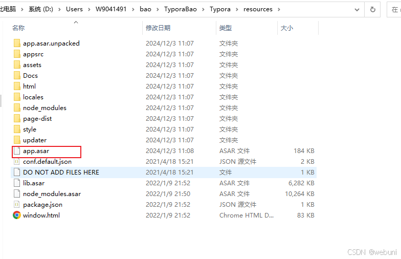 typora安装后,先不要打开软件,打开软件所在位置,将下载的app.asar.txt 文件中的后缀.txt去掉,并拷贝到typora安装路径下替换(如下路径)