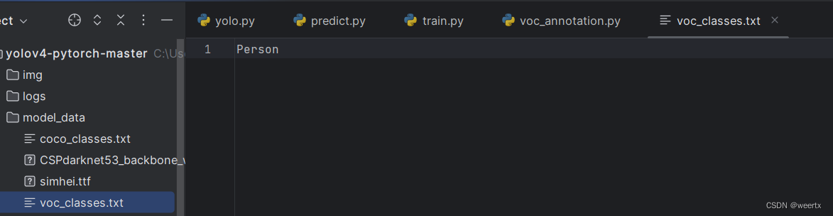 3.新建一个名为voc_classes的文本文档,将标签放进去,我们这里标注的只有人,所以只有Person这一个标签 。