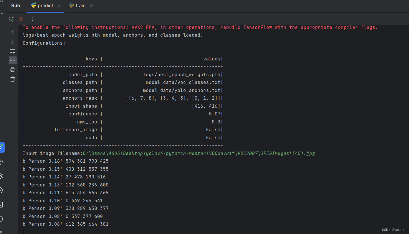 6.训练完完成后可以开始检测。因为我们的数据集只有两百张图片,所以检测精度很低,可以在yolo.py文件中改变模型地址,精度会高一点