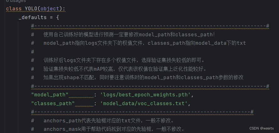 这里需要注意的是classes_path的路径,这里要放上上面我们创建的voc_classes.txt文件的路径。