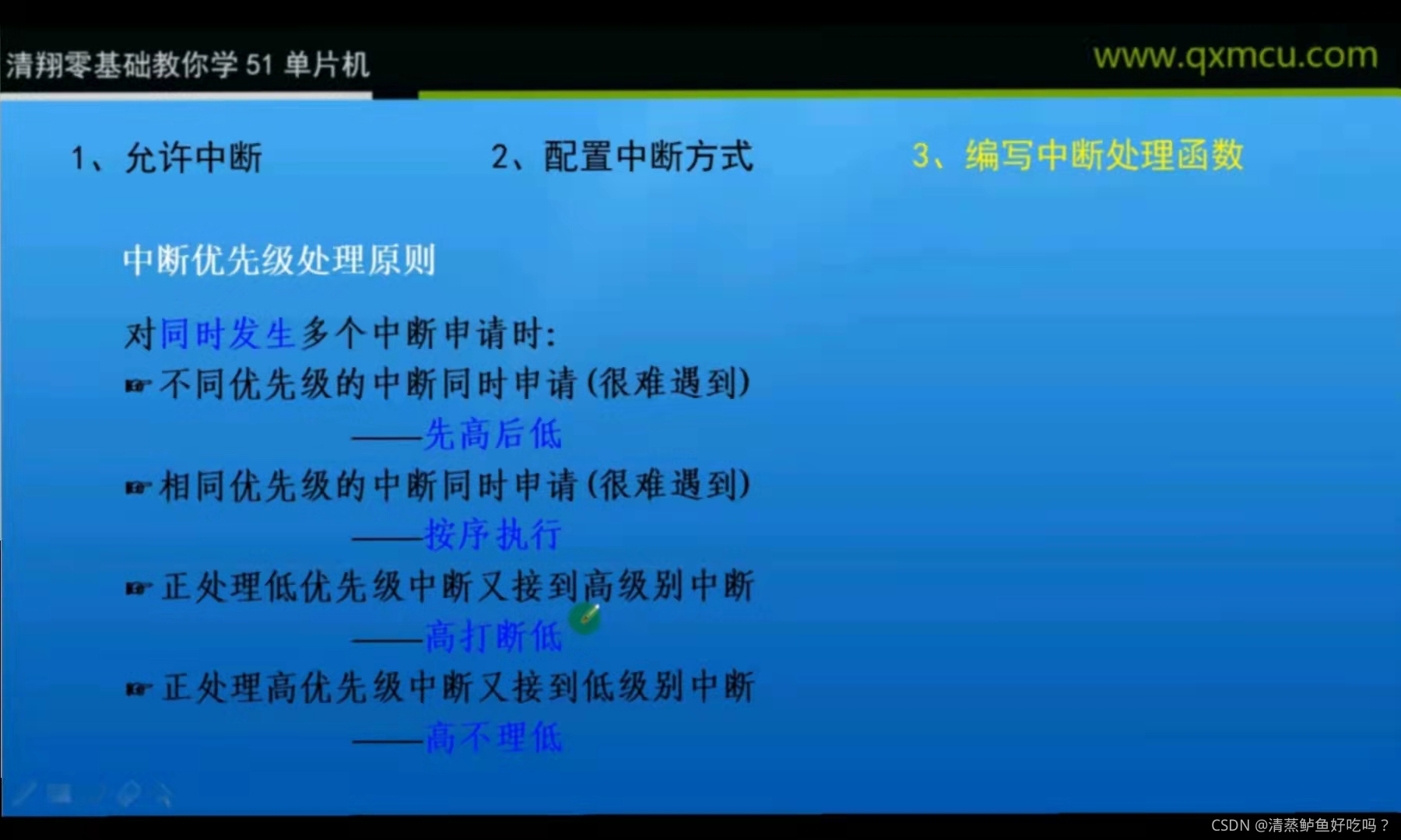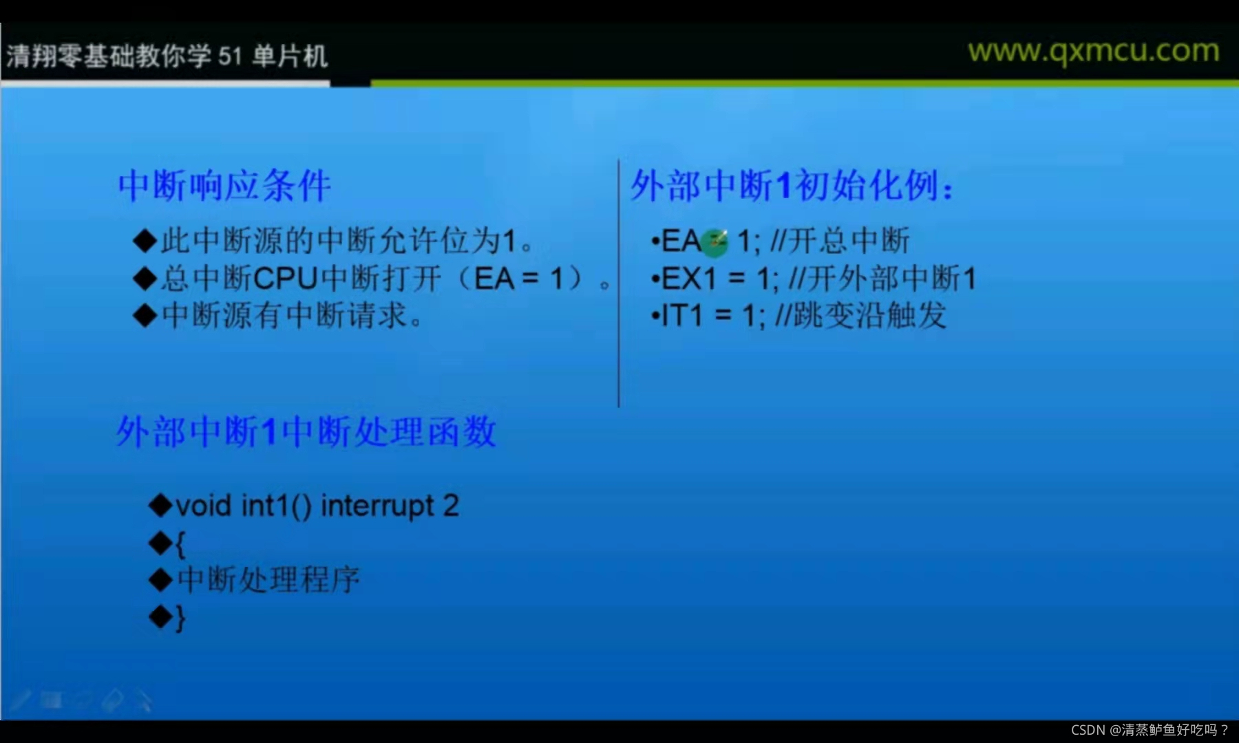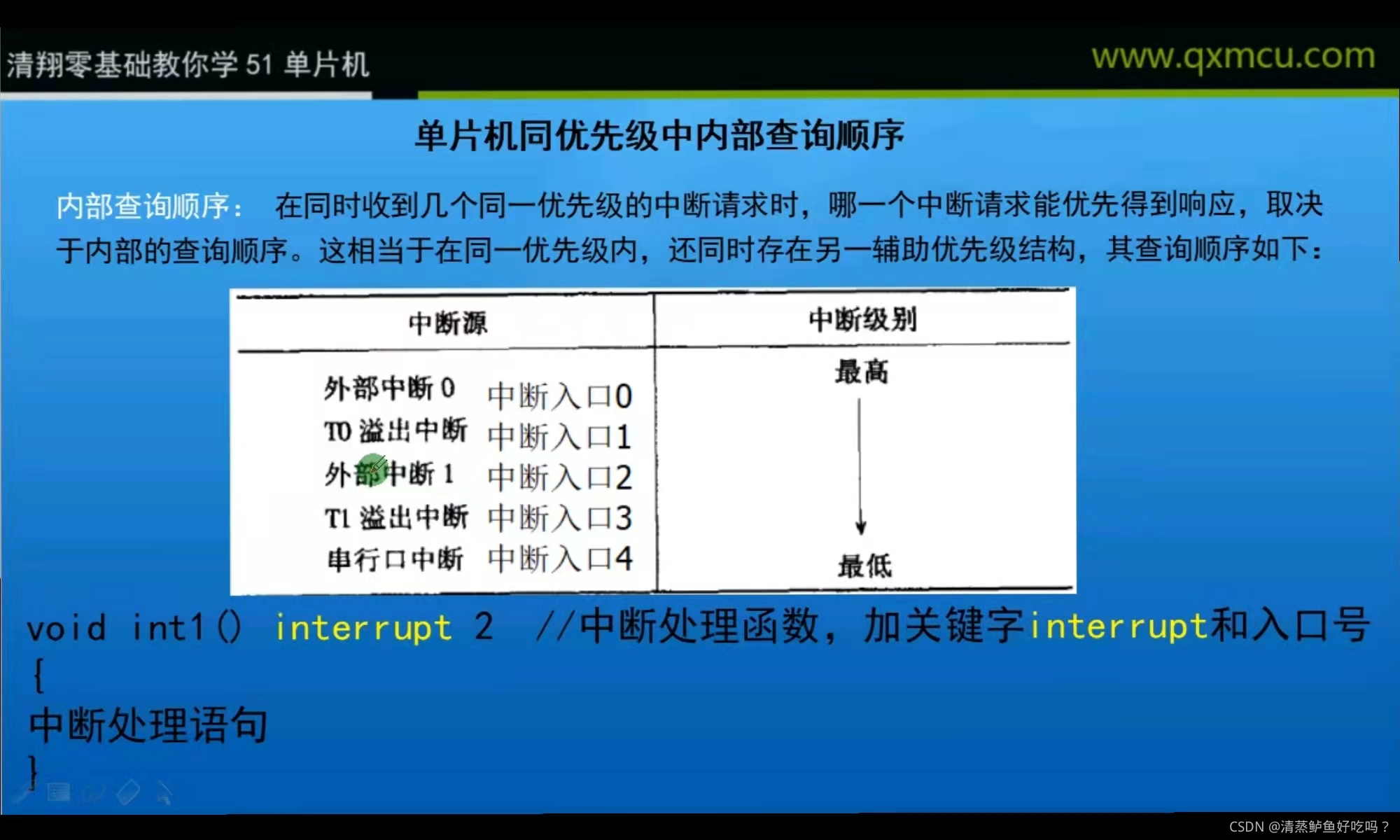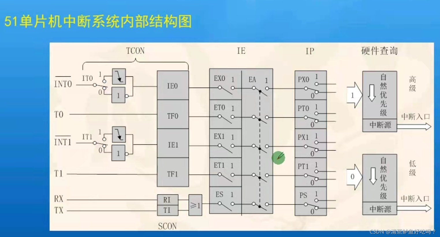 INT0——由P3.2端口线引入,低电平或下降沿触发(后面会介绍到控制低电平或下降沿触发的位)