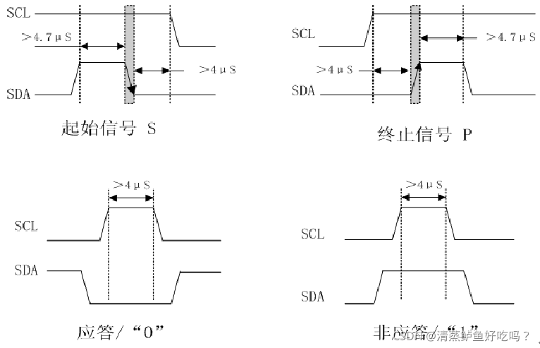 SCL线为高电平期间,SDA线由高电平向低电平的变化表示起始信号;SCL线为高电平期间,SDA线由低电平向高电平的变化表示终止信号。