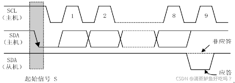 起始和终止信号都是由主机发出的,在起始信号产生后,总线就处于被占用的状态;在终止信号产生后,总线就处于空闲状态。