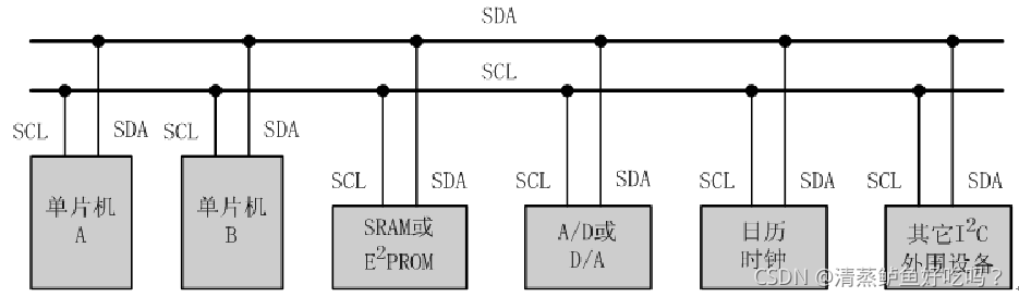 I2C总线:以同步串行2线方式进行通信(一条时钟线,一条数据线)。