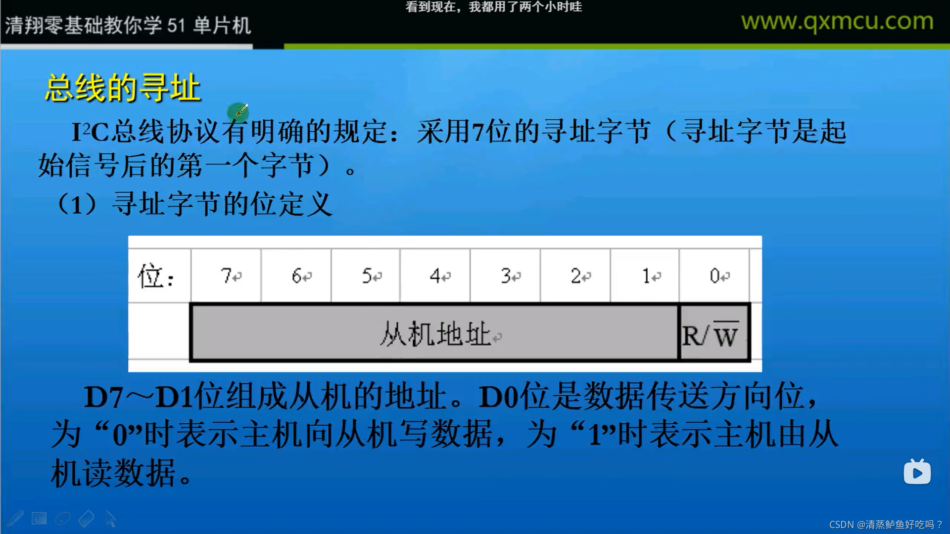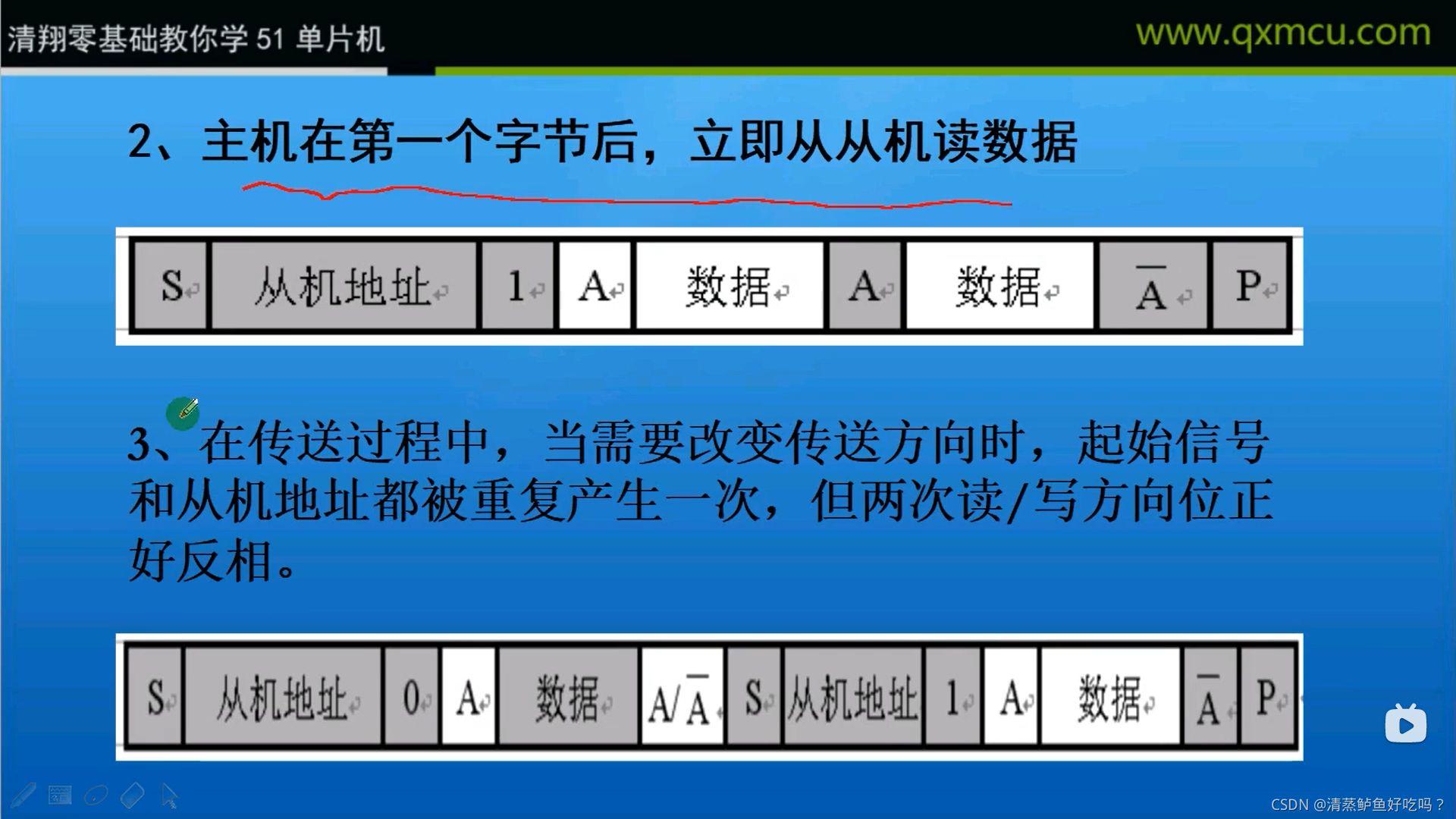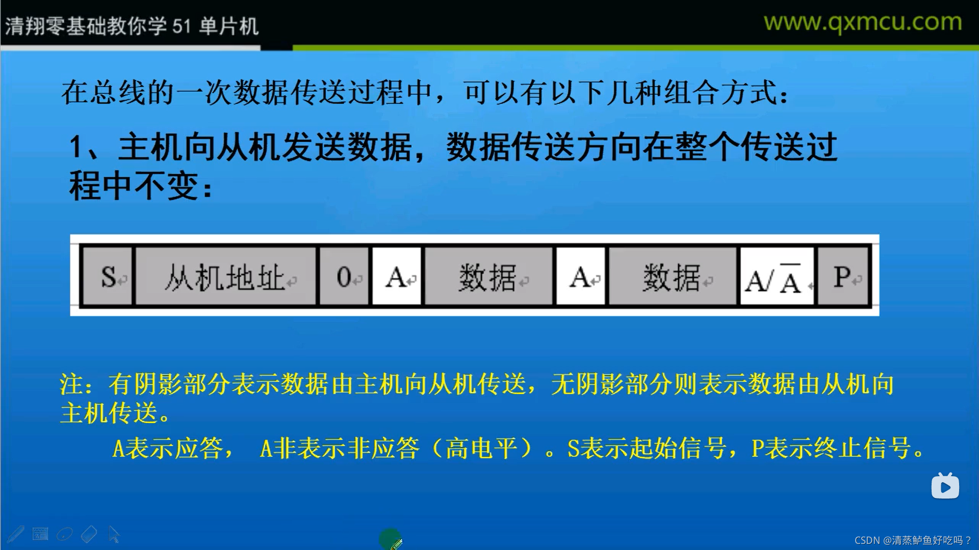 每一个字节必须保证是8位长度。数据传送时,先传送最高位(MSB),每一个被传送的字节后面都必须跟随一位应答位(即一帧共有9位)。