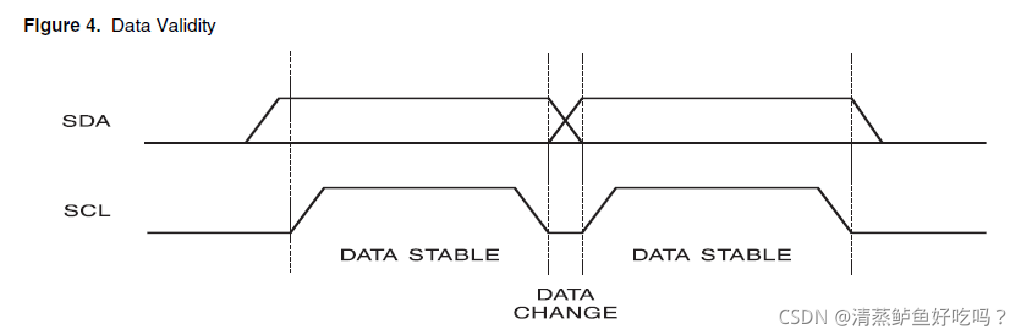 SCL为高电平期间,数据线上的数据必须保持稳定,只有SCL信号为低电平期间,SDA状态才允许变化。