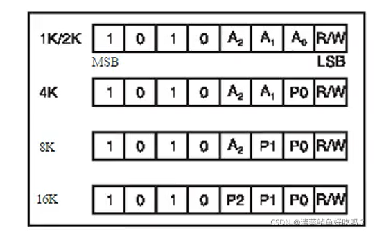从机地址例子(AT24C02的1k),这里不同内存版本的芯片不同可编程位数量。
