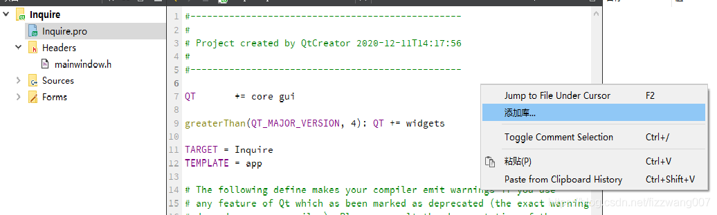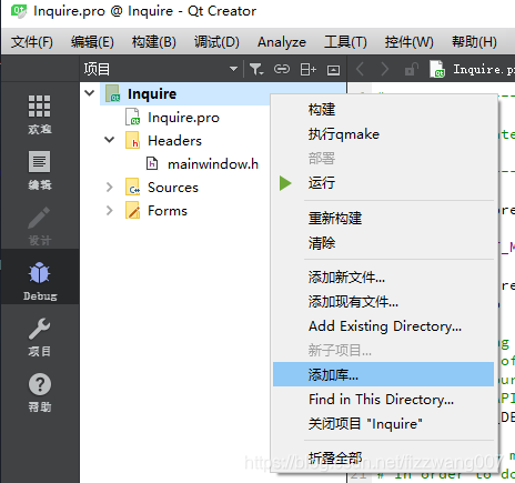 2、在 pro 文件界面内,右击鼠标,选择添加库
