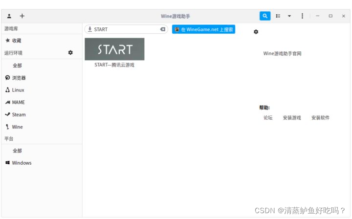 然后在 Wine 游戏助手搜索 START 云游戏并安装,这样就能愉快的玩各种游戏了。
