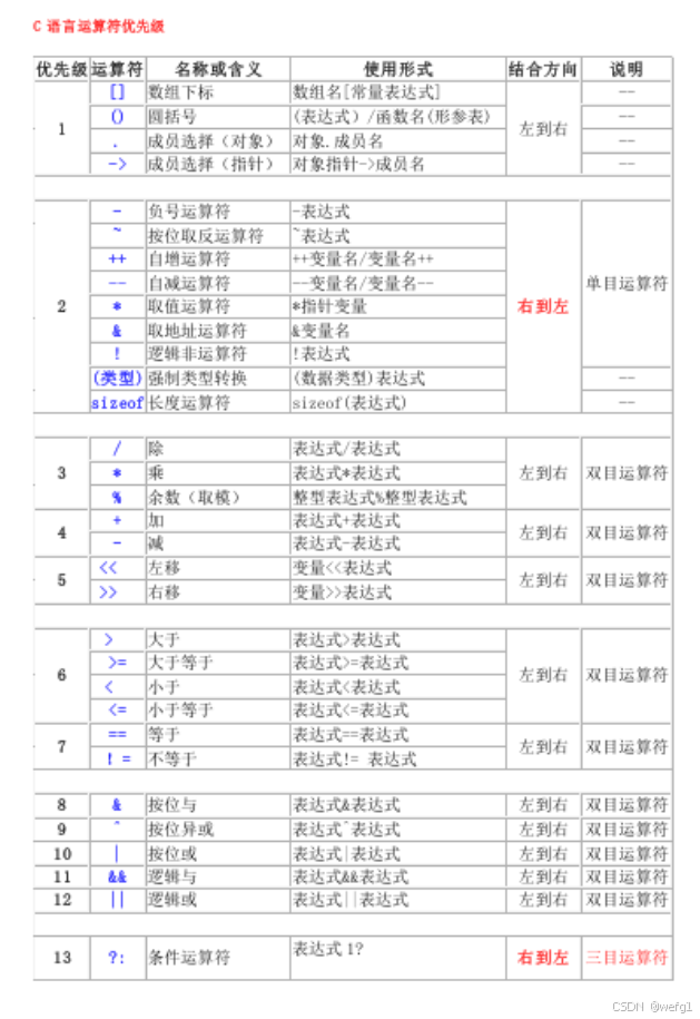 下标圆括号成员选择 > 单目运算符 > 算术运算符 > 位移运算符 > 关系运算符 > 按位运算符 > 逻辑运算符 > 三目运算符 > 赋值运算符 > 逗号运算符