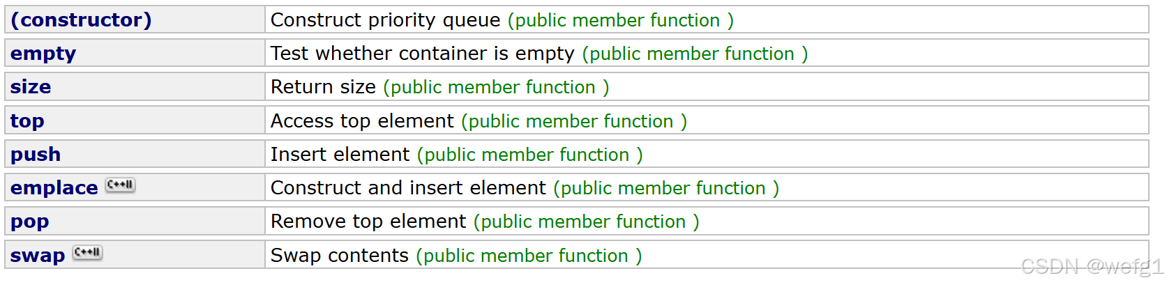 - 优先队列作为容器适配器实现,这些适配器类将特定容器类的封装对象作为底层容器,通过提供特定的成员函数集合来访问元素。元素从特定容器的"末端"弹出(此末端在优先队列中被称为顶部)。