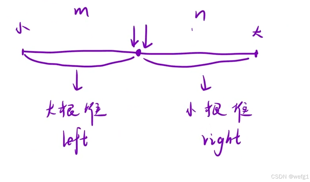假设一些有序的数据流,小于中位数的元素被放到一个大根堆里面,大于中位数的元素被放到一个小根堆里面,并规定:大根堆的元素个数为 m,小根堆的元素个数为 n,大根堆的堆顶元素为 下,小根堆的堆顶元素为 n,规定 m 和 n 一定要满足:要么 m == n,要么 m == n + 1。