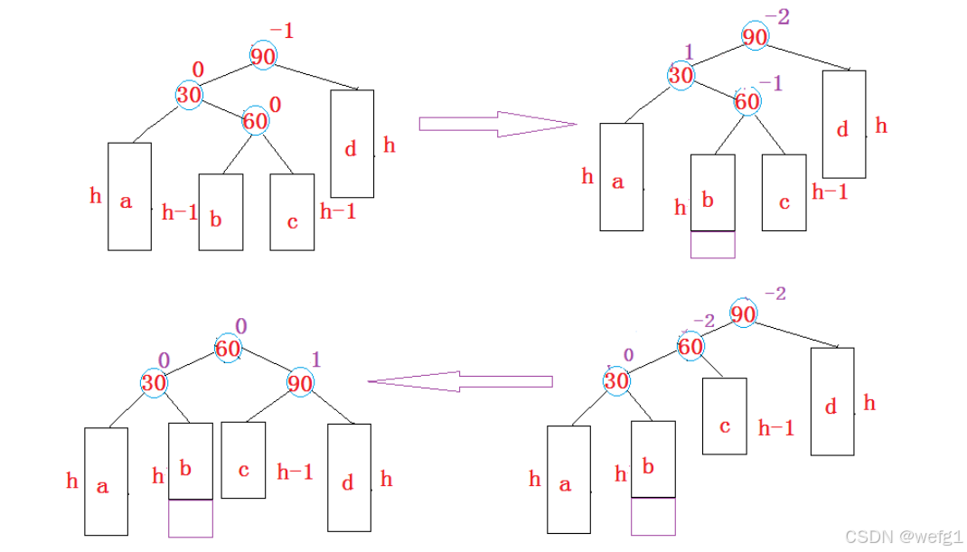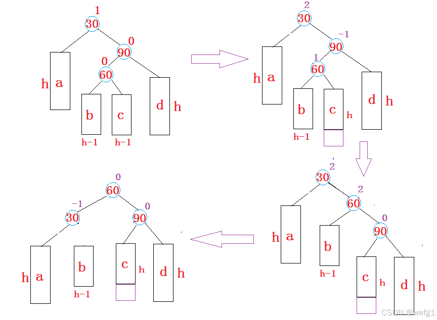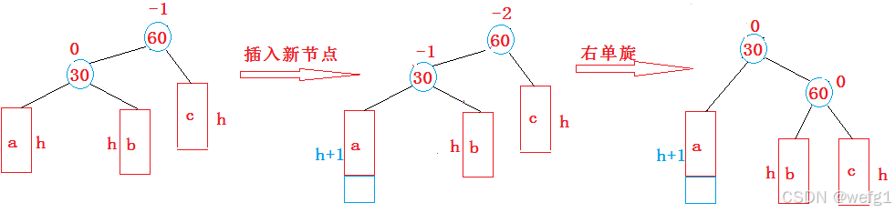 而如果30有右子树,右子树根的值一定大于30,小于60,只能将其放在60的左子树,旋转完成后,