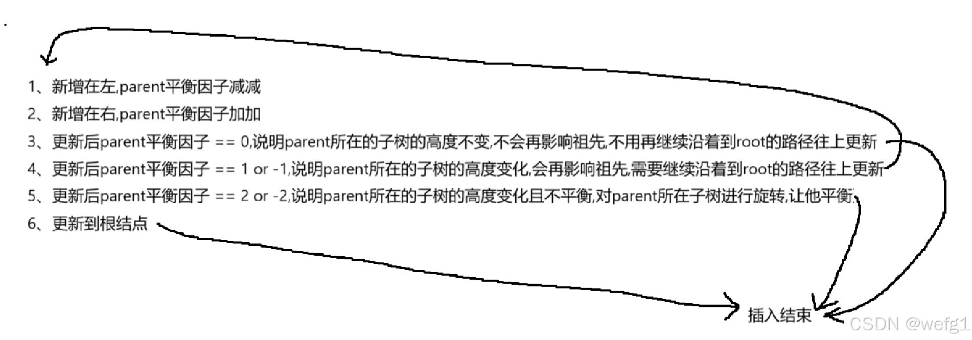 // 2. 新节点插入后,AVL树的平衡性可能会遭到破坏,此时就需要更新平衡因子,并检测是否