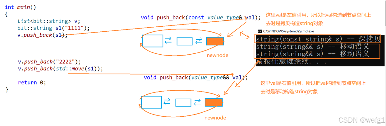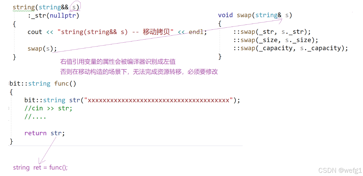 - 如果你没有自己实现移动赋值重载函数,且没有实现析构函数 、拷贝构造、拷贝赋值重载中的任意一个,那么编译器会自动生成一个默认移动赋值。默认生成的移动构造函数,对于内置类型成员会执行逐成员按字节拷贝,自定义类型成员,则需要看这个成员是否实现移动赋值,如果实现了就调用移动赋值,没有实现就调用拷贝赋值。(默认移动赋值跟上面移动构造完全类似)