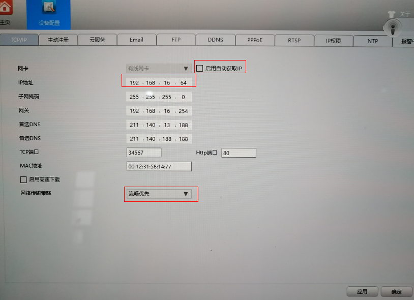 6、网络设置,初始IP不是192.168.16.64,需要将IP地址修改到局域网网段内,比如:192.168.16.10,根据单片程序选择使用哪个IP地址。必须将启用自动获取IP前面的√去掉,否则IP地址修改无效,重启后又会变成随机地址。
