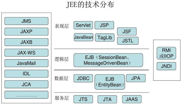 在JavaEE平台共包含了13个技术规范(随着JavaEE版本的变化所包含的技术点的数量会有增多)。它们分别是:JDBC、JNDI、EJB、RMI、Servlet、JSP、XML、JMS、Java IDL、JPA、JTA、JavaMail和JAF。