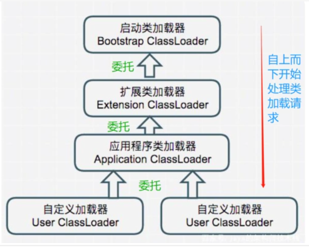 - 递归委派:父类加载器继续向上委派,直到请求到达最顶层的启动类加载器。