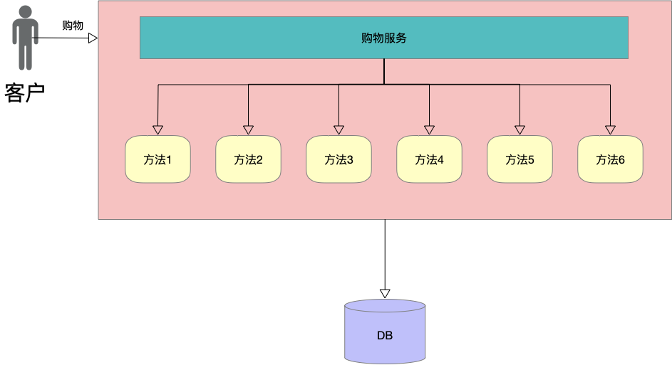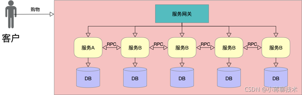 在之前传统单体架构上,代码都是打包在一起的,部署在同一个服务器上的。拿购物这个场景来说,虽然用户购物需要很多方法来支持,但是毕竟大家都是在一起的。就跟下楼去小卖店买东西是一个意思,虽然是老板给你拿的东西,但是你钱付给老板娘也没关系,老板娘隔着屋子喊一声,老板也能听得见,不会出什么幺儿子的。