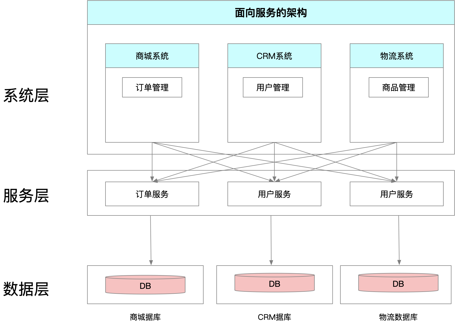 当垂直应用越来越多,将核心业务抽取出来,作为独立的服务,这种架构叫做“面向服务的架构”(SOA)。