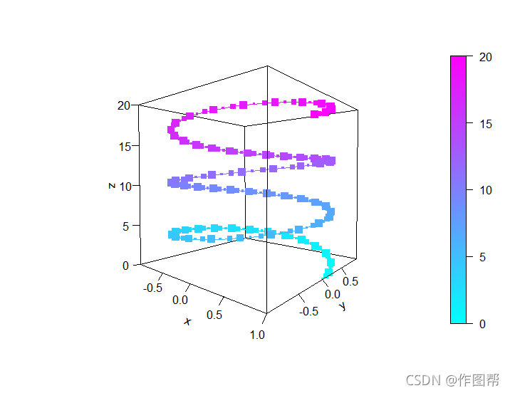 参数:phi:控制三维图的上下方向,col:点的颜色,pch:点的形状,cex:点放大多少倍,ticktype:坐标轴的刻度,bty:表示边框类型