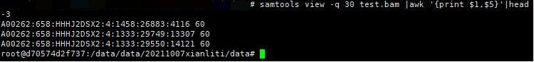 samtools view -q 30 test.bam |awk '{print $1,$5}'|head -3