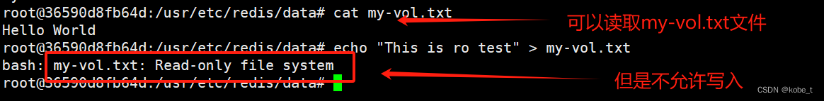 还是以前面的例子来验证一把,再运行一个容器test_redis2并挂载my-vol卷,指定权限为ro: