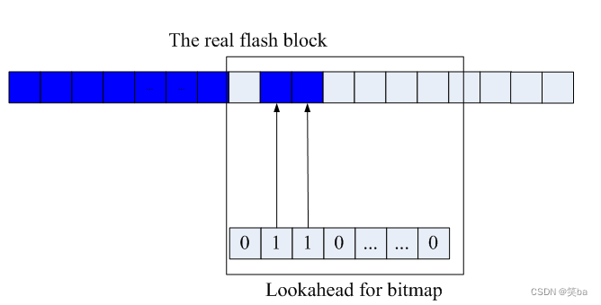 内存中的一个数组,用来表示block有没有被使用,了节省内容,Littlefs对空闲block的管理采用了滑窗方式,滑窗的大小是可以配置,默认是32bit,对应32个block的使用情况。