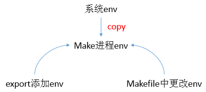 — 遇到的坑:由于我的ubuntu没有安装Java,没有使用JAVA_HOME这个环境变量,使用的是PATH环境变量,PATH := my path ,导致后面调用make出现错误。原因是由于make是一个进程,它会复制系统的一份环境变量来使用,复制的环境变量作用域是 "进程域", 上面 PATH := my path 就把该环境变量的值更改了,导致后面调用make时出现 "找不到命令" 的错误。环境变量之间的关系如下图所示。