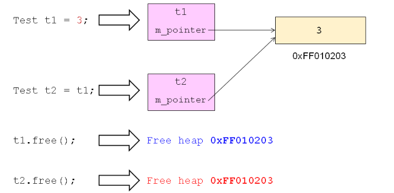 1 #include <stdio.h> 2 3 class Test 4 { 5 private: 6 int i; 7 int j; 8 int* p; 9 10 public: 11 int getI(){return i;} 12 13 int getJ(){return j;} 14 15 int* getP(){return p;} 16 17 /* 18 //拷贝构造函数 19 Test(const Test& t) 20 { 21 i = t.i; 22 j = t.j; 23 p = new int; 24 25 *p = *t.p; 26 } 27 */ 28 29 30 //带参构造函数 31 Test(int v) 32 { 33 i = 1; 34 j = 2; 35 p = new int; 36 37 *p = v; 38 } 39 40 ~Test(){delete p;} 41 42 }; 43 44 int main() 45 { 46 Test t1(3); //调用Test(int v); 47 Test t2(t1); //调用Test(const Test& t) 48 49 printf("t1.i = %d, t1.j = %d, *t1.p = %d\n", t1.getI(), t1.getJ(), *t1.getP()); 50 printf("t2.i = %d, t2.j = %d, *t2.p = %d\n", t2.getI(), t2.getJ(), *t2.getP()); 51 52 return 0; 53 }