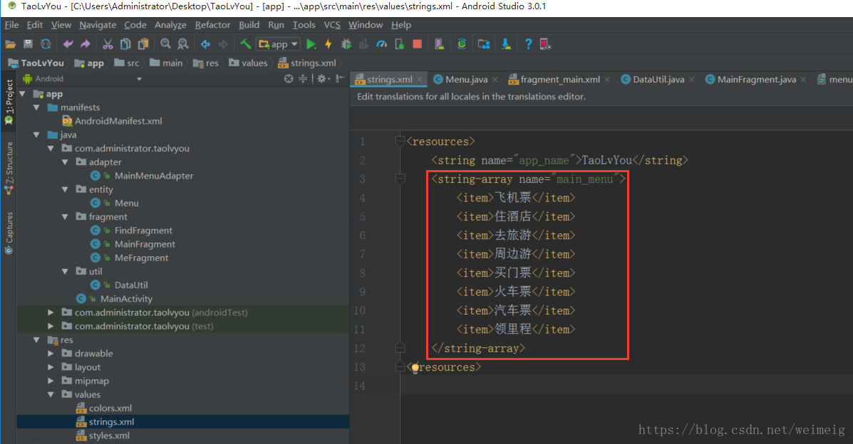 menus=this.getActivity().getResources().getStringArray(R.array.main_menu);//从string文件中,将数组数据拿出来