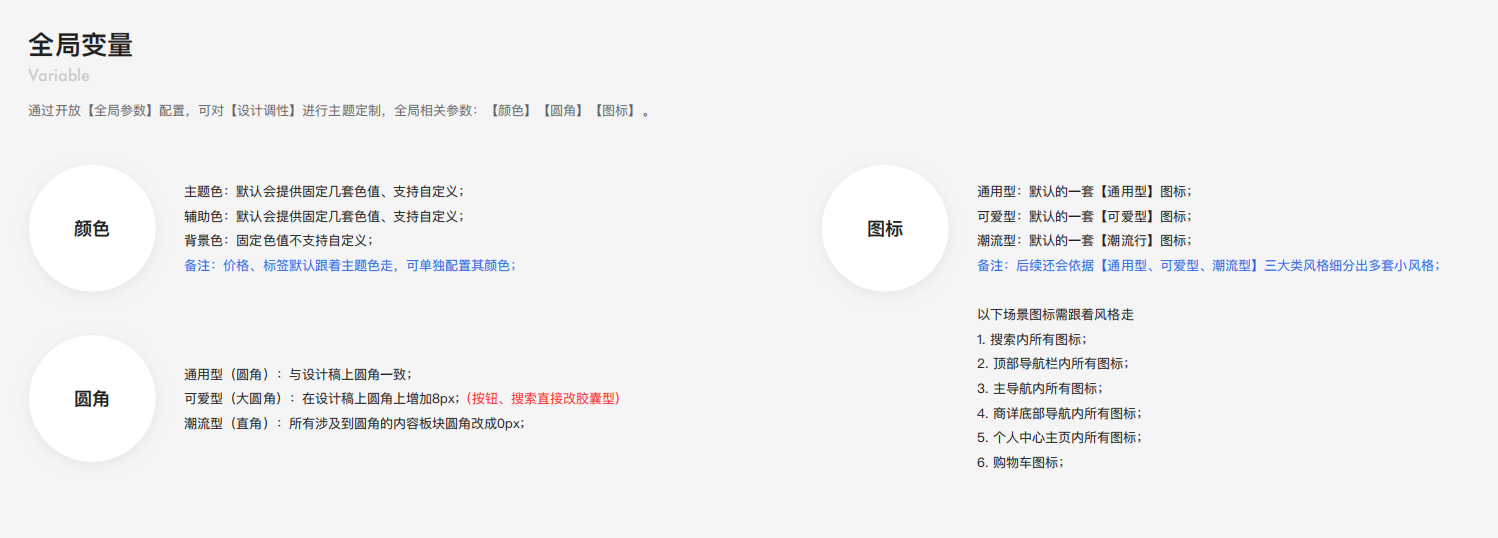 对于主题色的风格配置,由于有些组件使用的的具有百分比透明度的主题色,所以采用rgba色值更加方便。对于图标风格切换,从一种风格增加到三种风格,能不能尽量的不要增加代码体积,毕竟小程序对包体积有严格的要求。 对于圆角风格,有些需要将设计稿的圆角加8像素,有些需要变成直角,而有些又需要单独处理成大圆角。