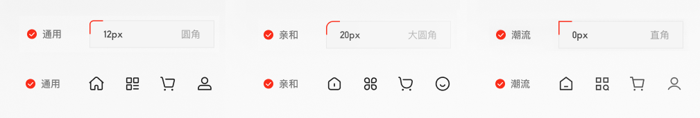在以前商户店铺的品牌视觉风格往往千篇一律,同时还因为需要逐个繁琐地配置界面中元素,导致的风格错乱等问题。针对上述的痛点,本次升级在确保商户品牌风格统一的前提下,基于品牌调性提炼了具有共性的视觉特征,分别为颜色、图标、圆角。并用这些特征组合为“通用”、“潮流”、“可爱”三套风格,能够让商家随心选择,让线上店铺更贴合自身的品牌调性,提高品牌识别度,维持C端用户的品牌心智。