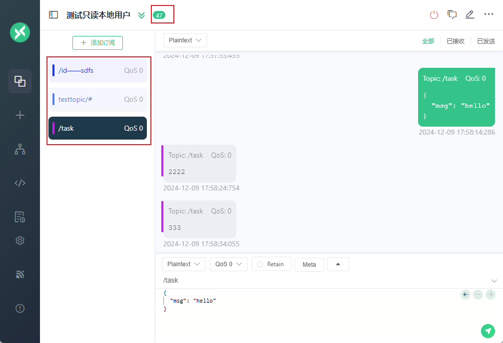 2、发送bug,自己建了一个只读用户,也就是这个用户只能订阅接收而不能发送,用我的程序提示正常,确实没有发出去,但是mqttx却提示发出去了,但是用mqttx也没有收到,说明根本就没有发出去。