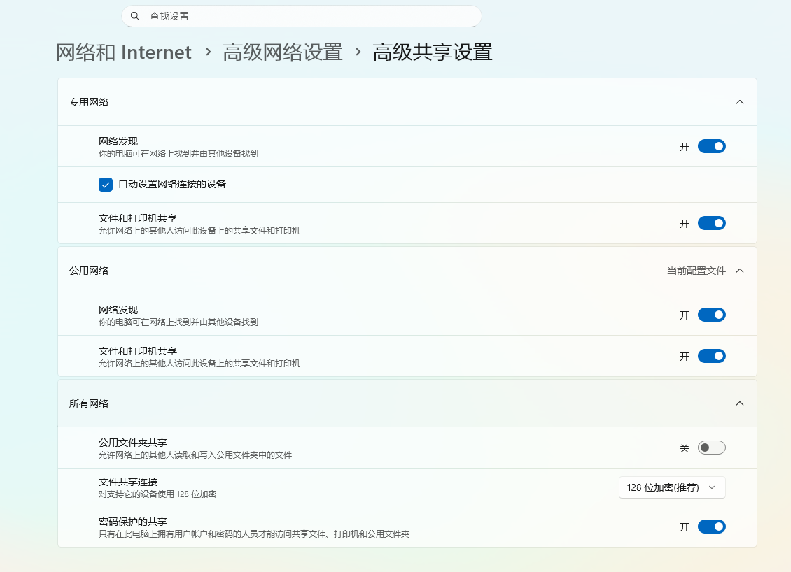 4.打开专用网络、公共网络的“网络发现”及“文件打印机共享”选项