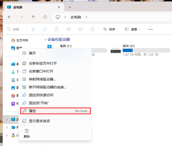 2、选择“属性”