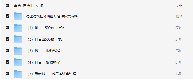 下图是资料核心内容预览,能看到科目一、四的真题技巧文档,科目二、三的视频教程分类,还有考试全过程资料