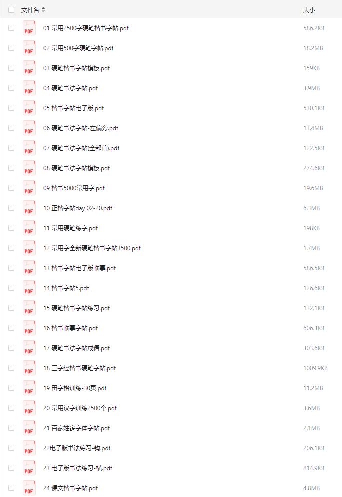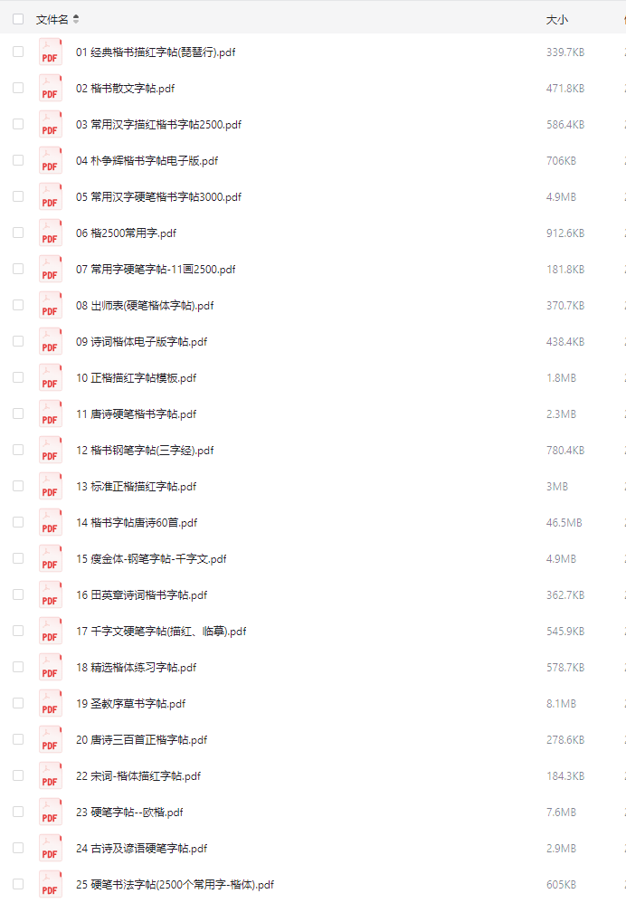 下图是资料核心内容预览,能看到楷书、行书、英文字帖,还有各种练字格子模板