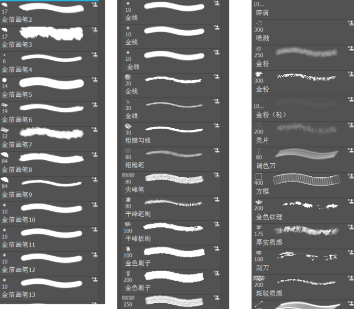 - 测试一下:新建画布,选画笔工具,找到刚导入的金箔笔刷,随便刷一下,出现金箔质感的笔触就说明装对了。