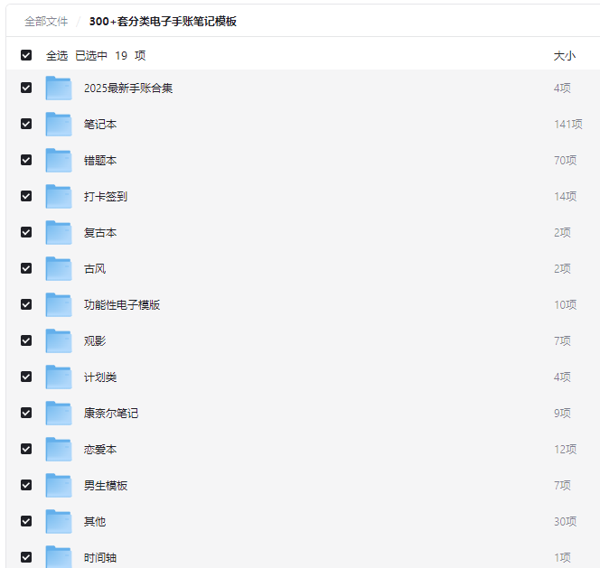 整理资料时翻到网盘里的电子手账模板合集,发现用它能解决手账风格单一、功能不全、制作耗时的痛点。从学习到生活记录,从规划到特色风格,300 + 套模板覆盖全场景,还支持 PDF/PNG 格式编辑,学生、职场人、手账爱好者都能找到专属款。