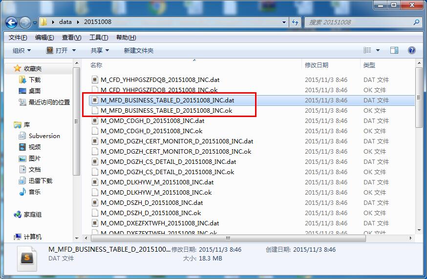 说下我们当时的场景吧。当时我手里边有几十个日志文件,每个日志文件中都有相同的关键字——“Rows are loaded.“用来显示没张表被导入的数据量。我希望统计出所有表被导入的数据量,最开始我使用的方式是一个一个文件打开找出里面被导入数据量的地方记录在另一个文件中。显然,这样做是很耗时的,效率低不说,而且可能出错。现在说一下后面我是如何使用PowerShell高效地达到这一目的的。因为现在没有当时的那批日志文件,所以以ok文件(也是文本文件)示例。现在我的桌面有一个data的文件夹,里面放了以很多日期命名的子文件下,子文件下有一批.data和.ok文件。.dat文件是数据文件,.ok文件是数据文件对应的记录文件,存有数据量信息。如下图所示: